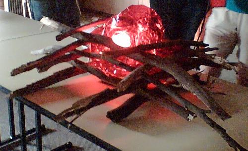 Having a good range of available songs that your group already knows is also important. By the way, you don't always need a real fire to run a campfire. You can use a pie-dish or similar filled with salt and metholated spirits for an indoor fire - but make sure you insulate the tray/dish from the floor so the heat does not damage anything. Keep it aside after the campfire, and store it away once cooled. Then just add metho to the salt next time you want to use it. You can also make an indoor fire like the one below, using sticks, cellophane and a lamp (preferably a cool one such as a compact fluorescent one). Screw the sticks together to make this nice and solid. Install a 240 or battery-operated light to suit your situation.